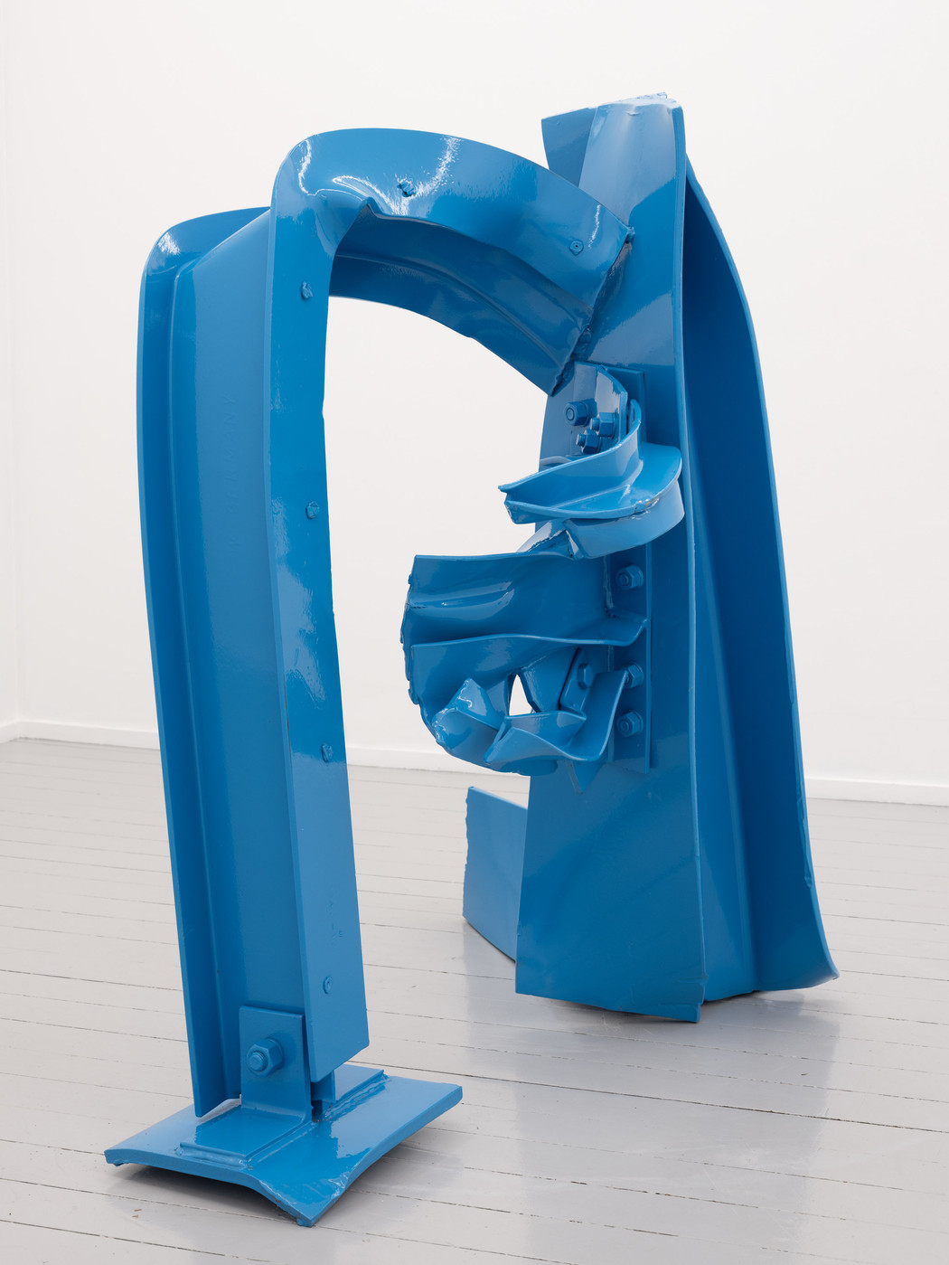 In the fall of 2024, Haugar Kunstmuseum presented the exhibition Sverre Wyller, the largest retrospective of Wyller’s work to date, including several series of paintings spanning 40 years and the later 20 years of sculpture. Among these was the restored and newly painted blue sculpture “Miramichi #3” from 2010-23, which anchors this exhibition. The sculpture, made from reworked demolition steel, was first shown at Galleri Riis in 2011 along with other works from the same series, produced in New Brunswick, Canada with materials from a dismantled industrial building.