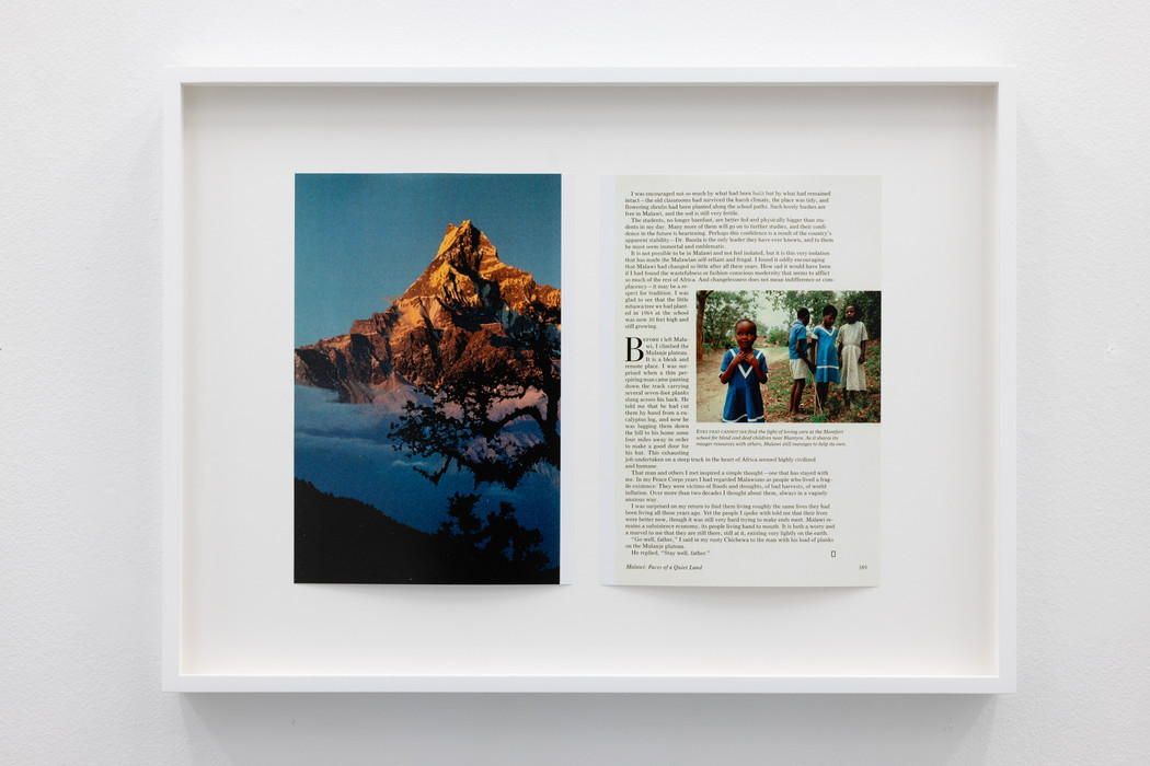 For the artist’s fifth solo exhibition with the gallery, Lisa Tan presents an installation of forty framed pieces that comprise National Geographic (Epoch), 2025. Each frame contains two printed images: recto and verso sides of clippings of photographs of mountains, amassed from the artist’s late father’s National Geographic magazine collection of the 1970s and 1980s. We see each mountain’s frontal view and adjacent is the literal and metaphorical other side. Turning each page, traversing from left to right, frame to frame, marks the passage of time and the accumulation of experience.